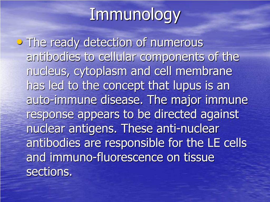 Immunology • The ready detection of numerous antibodies to cellular components of the nucleus, cytoplasm and cell membrane has led to the concept that lupus is an auto-immune disease. The major immune response appears to be directed against nuclear antigens. These anti-nuclear antibodies are responsible for the LE cells and immuno-fluorescence on tissue sections.