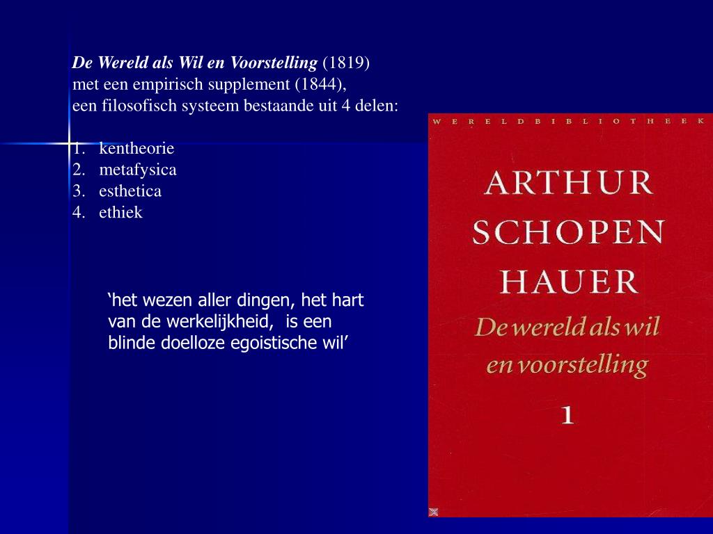De Wereld als Wil en Voorstelling (1819) • met een empirisch supplement (1844), • een filosofisch systeem bestaande uit 4 delen: • kentheorie • metafysica • esthetica • ethiek ‘het wezen aller dingen, het hart van de werkelijkheid, is een blinde doelloze egoistische wil’