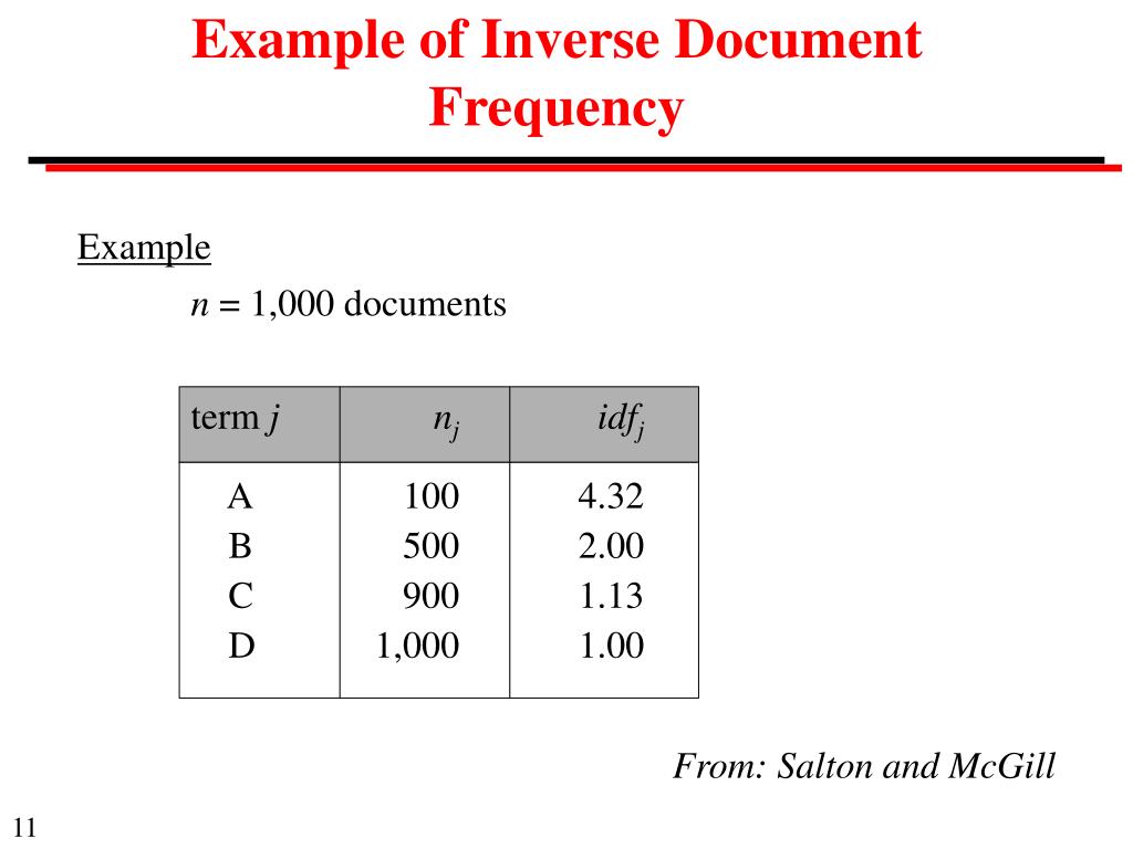 Example of Inverse Document Frequency Example n = 1,000 documents term jnjidfj A 100 4.32 B 500 2.00 C 900 1.13 D 1,000 1.00 From: Salton and McGill
