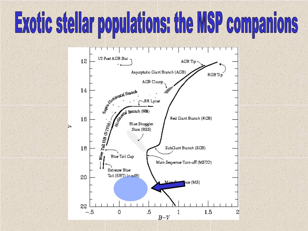 Optical companions to MSP in GGCs THE MSP RE-CYCLING SCENARIO - MSP are thought to form in binary systems containing a NS which is eventually spun up through mass accretion from an evolving companion The result will be a new born MSP + an exhausted star (which has lost most of its envelope) = the core of a peeled star (He-WD). 50% of the Galaxy MSP have been found in GGCs Optical identification of MSP companion = optical and spectroscopic follow-up. Light curve = orbital inclination + mass ratio from the velocity curve = empirical estimate of the pulsar mass .. Constraining the state of the degenerate matter in a neutron star