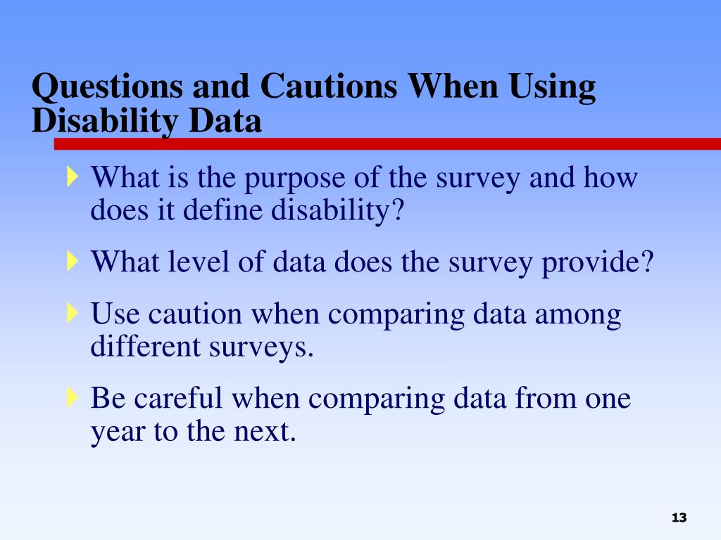 Questions and Cautions When Using Disability Data • What is the purpose of the survey and how does it define disability? • What level of data does the survey provide? • Use caution when comparing data among different surveys. • Be careful when comparing data from one year to the next.