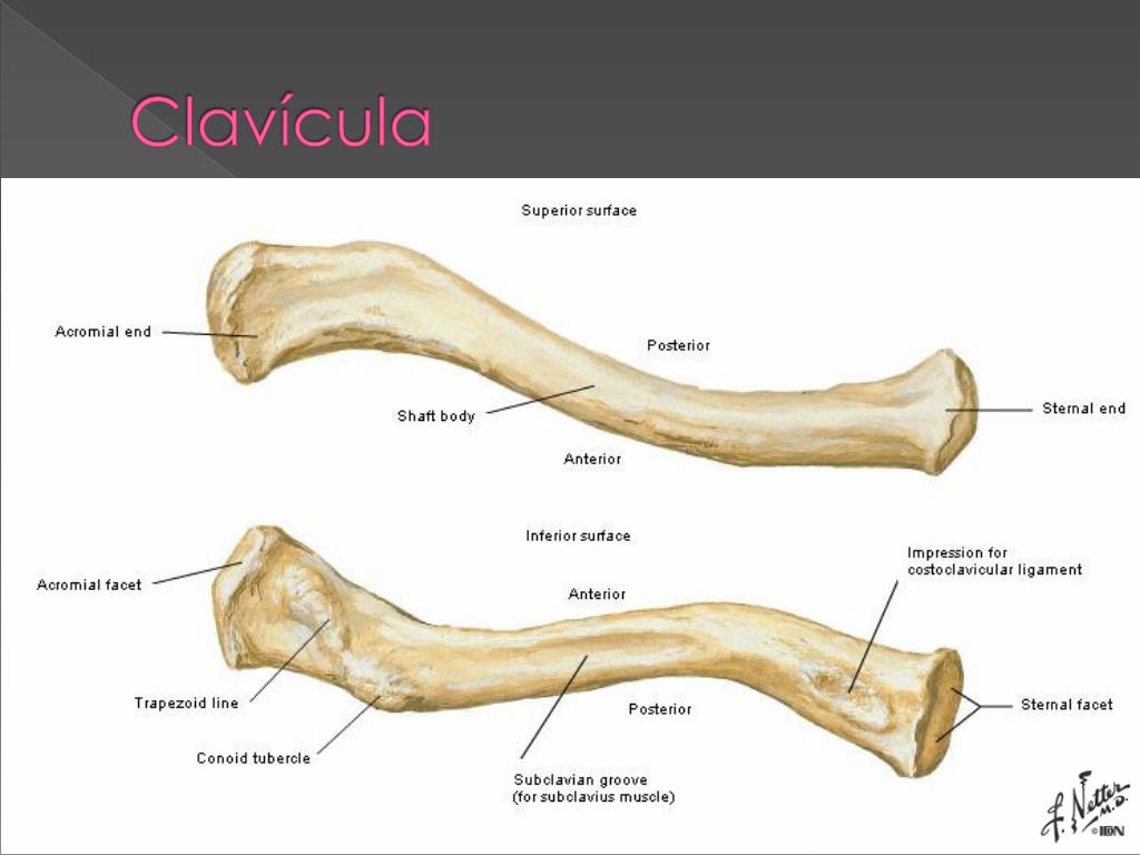Clavícula • Conecta el miembro superior al tronco. • Actúa como puntal móvil permitiendo que la escápula se desplace. • Mantiene alejado a la escápula del tronco y el miembro superior libre. • El cuerpo tiene doble curvatura en plano horizontal. • La mitad medial es convexa anteriormente. • La extremidad esternal se articula con el manubio del esternón. • La mitad lateral es cóncava anteriormente. • La extremidad acromial es plana y se articula con el acromion de la escápula. • Curvaturas aumentan la flexibilidad y apariencia de “S”.
