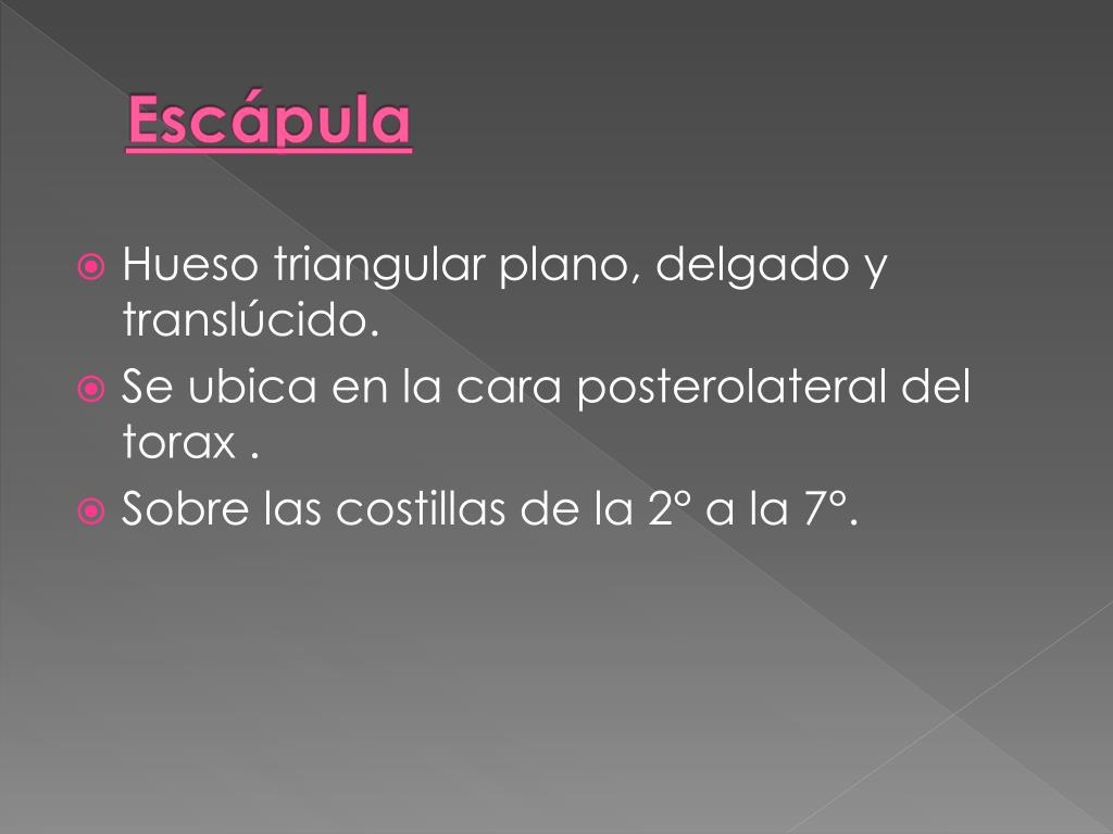Escápula • Hueso triangular plano, delgado y translúcido. • Se ubica en la cara posterolateral del torax . • Sobre las costillas de la 2° a la 7°.