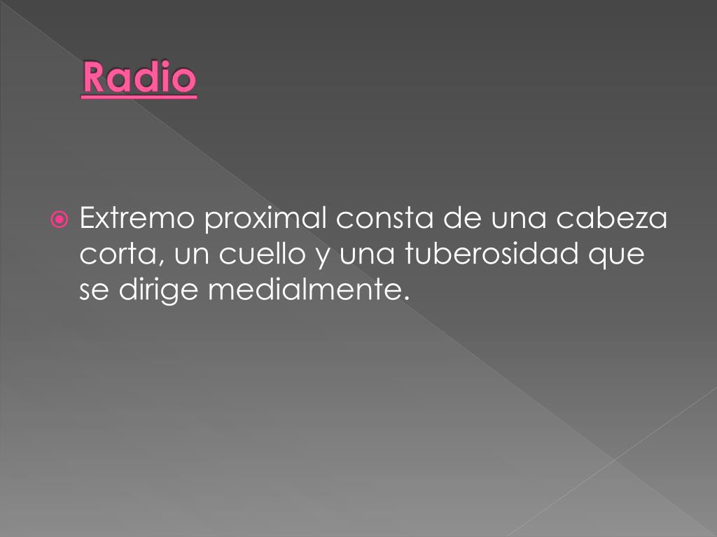 Radio • Extremo proximal consta de una cabeza corta, un cuello y una tuberosidad que se dirige medialmente.
