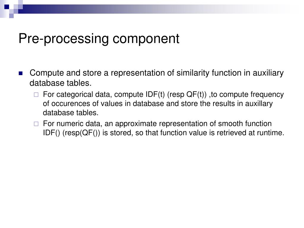 Pre-processing component • Compute and store a representation of similarity function in auxiliary database tables. • For categorical data, compute IDF(t) (resp QF(t)) ,to compute frequency of occurences of values in database and store the results in auxillary database tables. • For numeric data, an approximate representation of smooth function IDF() (resp(QF()) is stored, so that function value is retrieved at runtime.