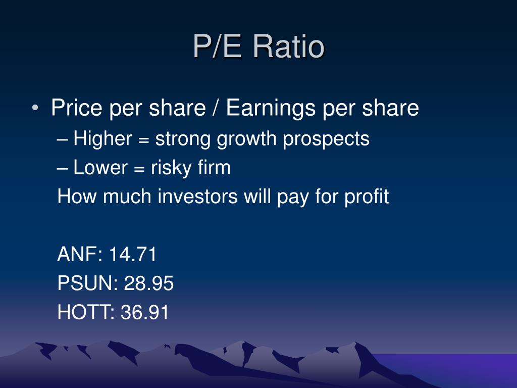 P/E Ratio • Price per share / Earnings per share • Higher = strong growth prospects • Lower = risky firm How much investors will pay for profit ANF: 14.71 PSUN: 28.95 HOTT: 36.91