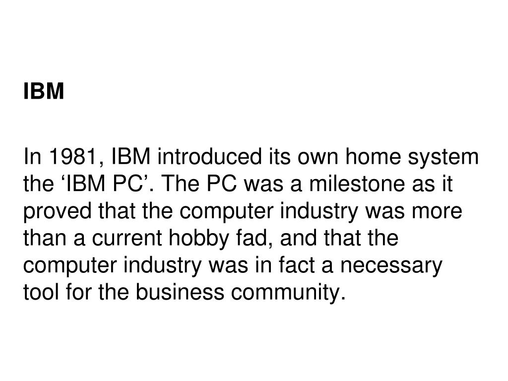 IBM In 1981, IBM introduced its own home system the ‘IBM PC’. The PC was a milestone as it proved that the computer industry was more than a current hobby fad, and that the computer industry was in fact a necessary tool for the business community.