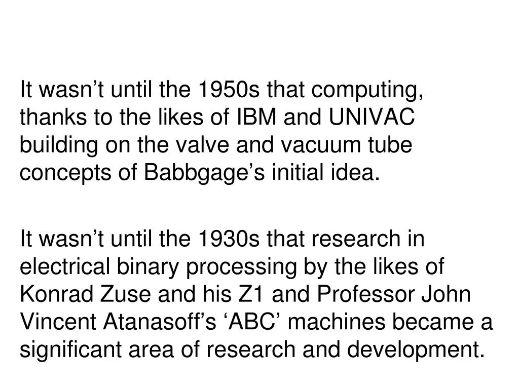 It wasn’t until the 1950s that computing, thanks to the likes of IBM and UNIVAC building on the valve and vacuum tube concepts of Babbgage’sinitial idea. It wasn’t until the 1930s that research in electrical binary processing by the likes of KonradZuse and his Z1 and Professor John Vincent Atanasoff’s ‘ABC’ machines became a significant area of research and development.