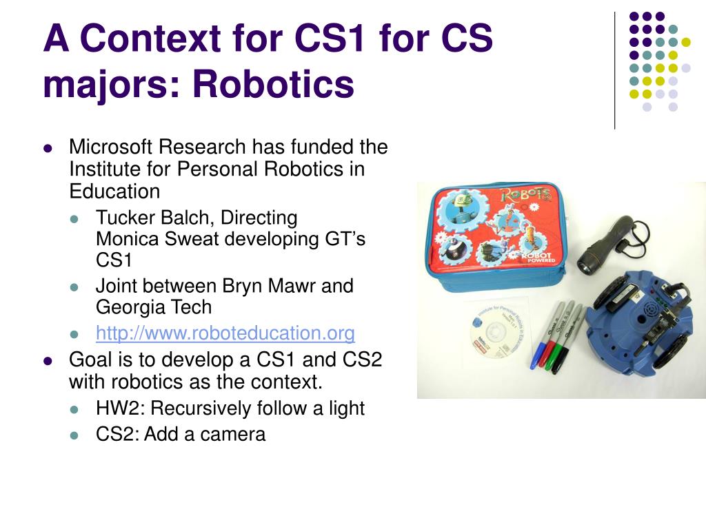 A Context for CS1 for CS majors: Robotics • Microsoft Research has funded the Institute for Personal Robotics in Education • Tucker Balch, DirectingMonica Sweat developing GT’s CS1 • Joint between Bryn Mawr and Georgia Tech • http://www.roboteducation.org • Goal is to develop a CS1 and CS2 with robotics as the context. • HW2: Recursively follow a light • CS2: Add a camera