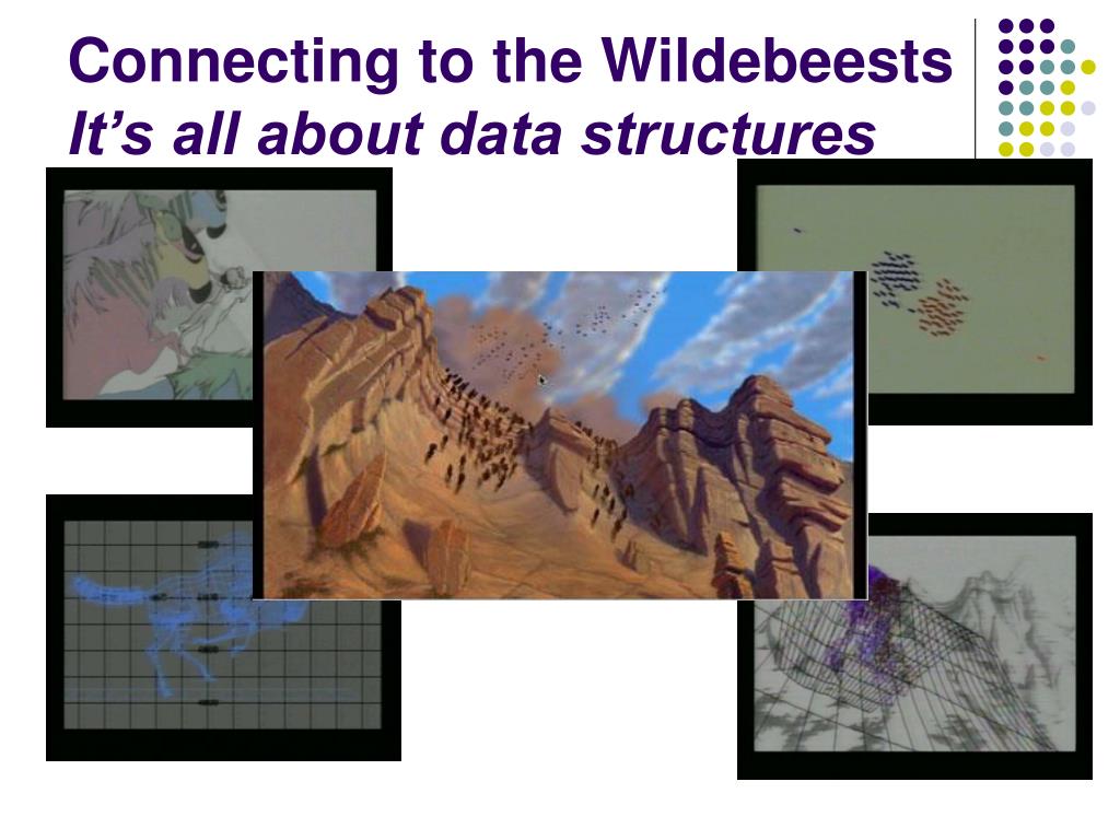 Story • Where have all the students gone?Teaching Computing for Everyone • First course: Introduction to Media Computation • It’s about context • What students do in it • Second course: Representing Structure and Behavior • Using Disney’s Wildebeests and Villagers,as a context for learning data structures • Beyond the two courses: A path into CS • A context in our CS1 • Applying contexts more broadly: Threads™