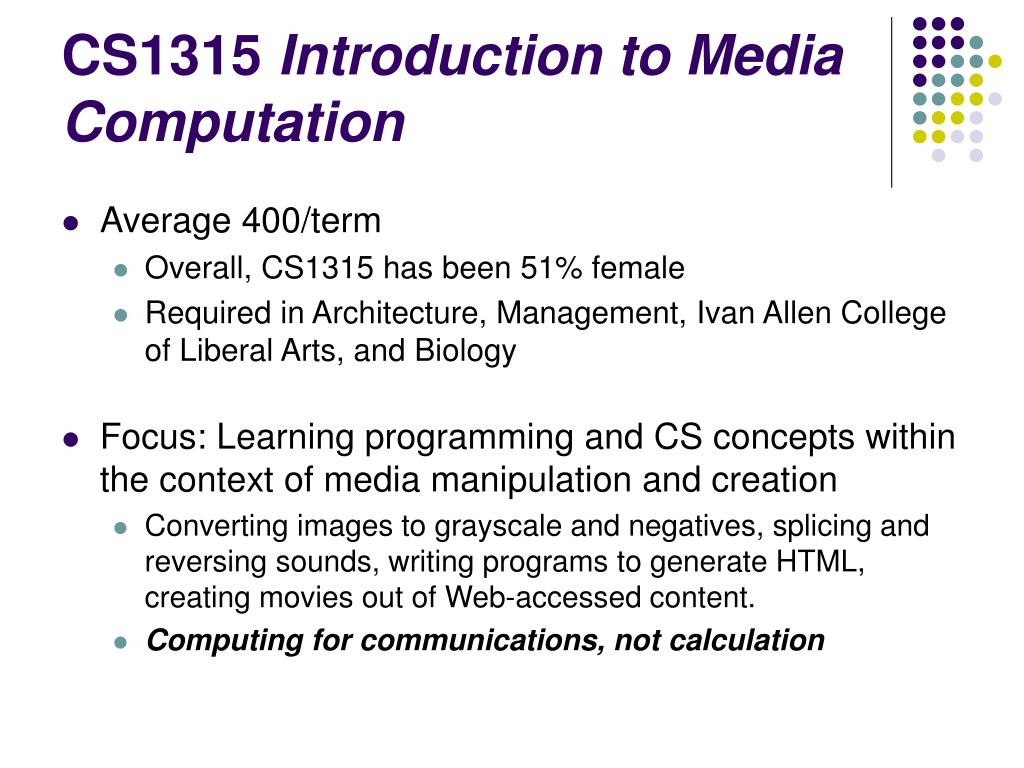 CS1315 Introduction to Media Computation • Average 400/term • Overall, CS1315 has been 51% female • Required in Architecture, Management, Ivan Allen College of Liberal Arts, and Biology • Focus: Learning programming and CS concepts within the context of media manipulation and creation • Converting images to grayscale and negatives, splicing and reversing sounds, writing programs to generate HTML, creating movies out of Web-accessed content. • Computing for communications, not calculation