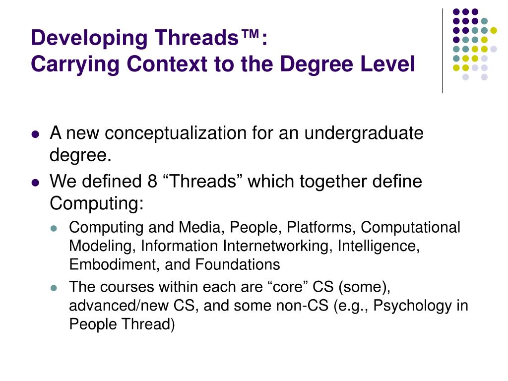 Developing Threads™: Carrying Context to the Degree Level • A new conceptualization for an undergraduate degree. • We defined 8 “Threads” which together define Computing: • Computing and Media, People, Platforms, Computational Modeling, Information Internetworking, Intelligence, Embodiment, and Foundations • The courses within each are “core” CS (some), advanced/new CS, and some non-CS (e.g., Psychology in People Thread)
