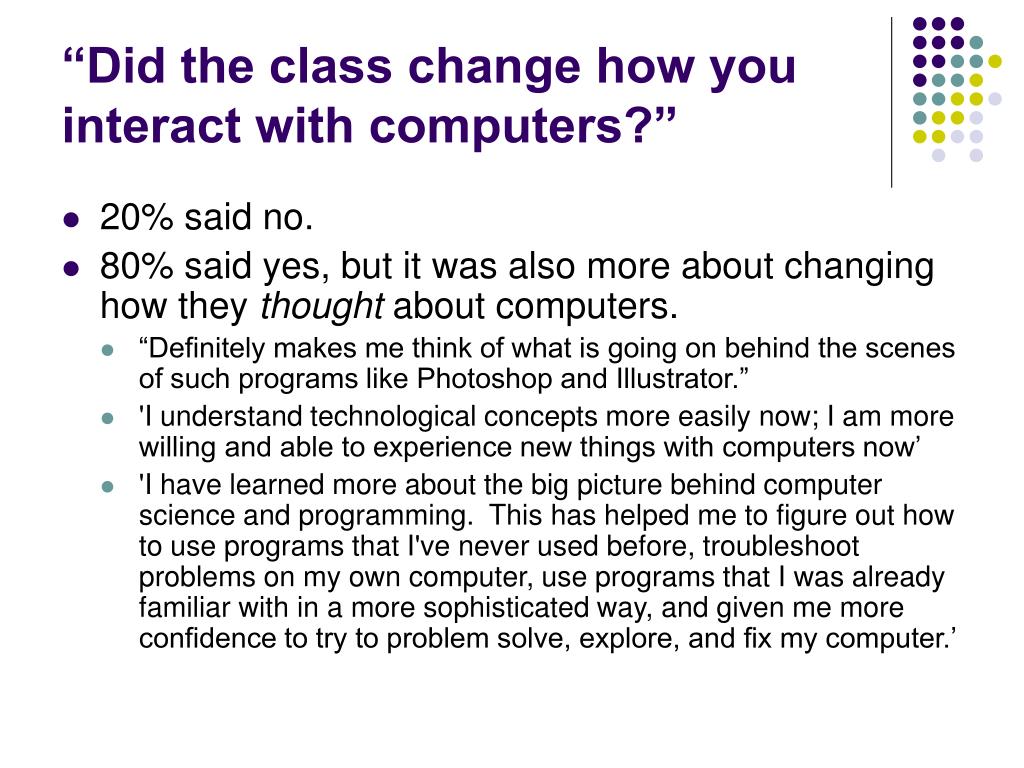 “Did the class change how you interact with computers?” • 20% said no. • 80% said yes, but it was also more about changing how they thought about computers. • “Definitely makes me think of what is going on behind the scenes of such programs like Photoshop and Illustrator.” • 'I understand technological concepts more easily now; I am more willing and able to experience new things with computers now’ • 'I have learned more about the big picture behind computer science and programming. This has helped me to figure out how to use programs that I've never used before, troubleshoot problems on my own computer, use programs that I was already familiar with in a more sophisticated way, and given me more confidence to try to problem solve, explore, and fix my computer.’
