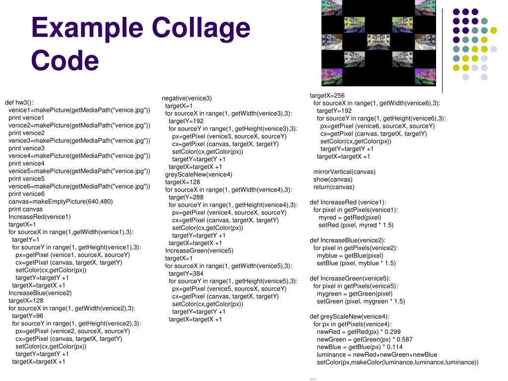 def hw3(): venice1=makePicture(getMediaPath("venice.jpg")) print venice1 venice2=makePicture(getMediaPath("venice.jpg")) print venice2 venice3=makePicture(getMediaPath("venice.jpg")) print venice3 venice4=makePicture(getMediaPath("venice.jpg")) print venice4 venice5=makePicture(getMediaPath("venice.jpg")) print venice5 venice6=makePicture(getMediaPath("venice.jpg")) print venice6 canvas=makeEmptyPicture(640,480) print canvas IncreaseRed(venice1) targetX=1 for sourceX in range(1,getWidth(venice1),3): targetY=1 for sourceY in range(1, getHeight(venice1),3): px=getPixel (venice1, sourceX, sourceY) cx=getPixel (canvas, targetX, targetY) setColor(cx,getColor(px)) targetY=targetY +1 targetX=targetX +1 IncreaseBlue(venice2) targetX=128 for sourceX in range(1, getWidth(venice2),3): targetY=96 for sourceY in range(1, getHeight(venice2),3): px=getPixel (venice2, sourceX, sourceY) cx=getPixel (canvas, targetX, targetY) setColor(cx,getColor(px)) targetY=targetY +1 targetX=targetX +1 negative(venice3) targetX=1 for sourceX in range(1, getWidth(venice3),3): targetY=192 for sourceY in range(1, getHeight(venice3),3): px=getPixel (venice3, sourceX, sourceY) cx=getPixel (canvas, targetX, targetY) setColor(cx,getColor(px)) targetY=targetY +1 targetX=targetX +1 greyScaleNew(venice4) targetX=128 for sourceX in range(1, getWidth(venice4),3): targetY=288 for sourceY in range(1, getHeight(venice4),3): px=getPixel (venice4, sourceX, sourceY) cx=getPixel (canvas, targetX, targetY) setColor(cx,getColor(px)) targetY=targetY +1 targetX=targetX +1 IncreaseGreen(venice5) targetX=1 for sourceX in range(1, getWidth(venice5),3): targetY=384 for sourceY in range(1, getHeight(venice5),3): px=getPixel (venice5, sourceX, sourceY) cx=getPixel (canvas, targetX, targetY) setColor(cx,getColor(px)) targetY=targetY +1 targetX=targetX +1 Example CollageCode targetX=256 for sourceX in range(1, getWidth(venice6),3): targetY=192 for sourceY in range(1, getHeight(venice6),3): px=getPixel (venice6, sourceX, sourceY) cx=getPixel (canvas, targetX, targetY) setColor(cx,getColor(px)) targetY=targetY +1 targetX=targetX +1 mirrorVertical(canvas) show(canvas) return(canvas) def IncreaseRed (venice1): for pixel in getPixels(venice1): myred = getRed(pixel) setRed (pixel, myred * 1.5) def IncreaseBlue(venice2): for pixel in getPixels(venice2): myblue = getBlue(pixel) setBlue (pixel, myblue * 1.5) def IncreaseGreen(venice5): for pixel in getPixels(venice5): mygreen = getGreen(pixel) setGreen (pixel, mygreen * 1.5) def greyScaleNew(venice4): for px in getPixels(venice4): newRed = getRed(px) * 0.299 newGreen = getGreen(px) * 0.587 newBlue = getBlue(px) * 0.114 luminance = newRed+newGreen+newBlue setColor(px,makeColor(luminance,luminance,luminance)) …