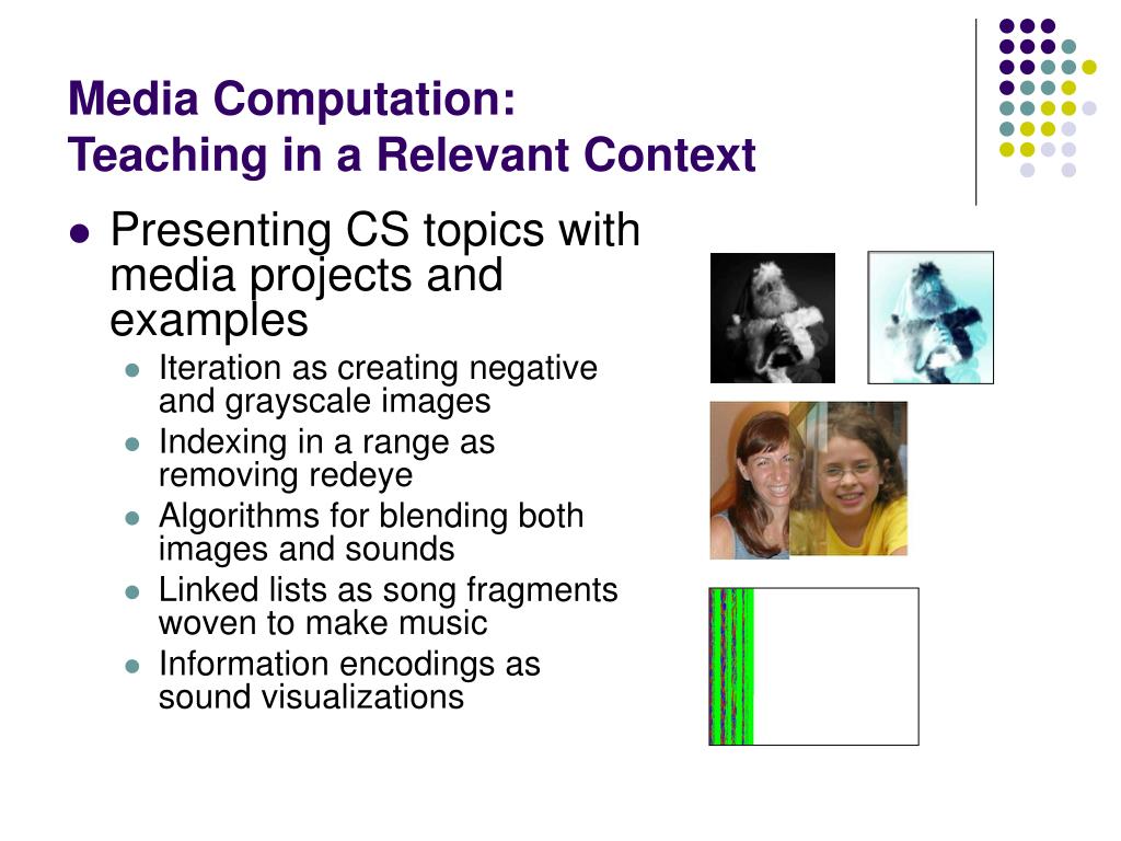 Media Computation: Teaching in a Relevant Context • Presenting CS topics with media projects and examples • Iteration as creating negative and grayscale images • Indexing in a range as removing redeye • Algorithms for blending both images and sounds • Linked lists as song fragments woven to make music • Information encodings as sound visualizations