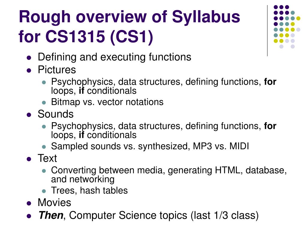 Rough overview of Syllabus for CS1315 (CS1) • Defining and executing functions • Pictures • Psychophysics, data structures, defining functions, for loops, if conditionals • Bitmap vs. vector notations • Sounds • Psychophysics, data structures, defining functions, for loops, if conditionals • Sampled sounds vs. synthesized, MP3 vs. MIDI • Text • Converting between media, generating HTML, database, and networking • Trees, hash tables • Movies • Then, Computer Science topics (last 1/3 class)
