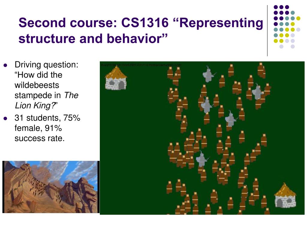 Second course: CS1316 “Representing structure and behavior” • Driving question: “How did the wildebeests stampede in The Lion King?” • 31 students, 75% female, 91% success rate.