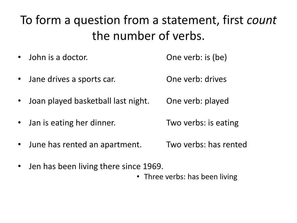 To form a question from a statement, first count the number of verbs. • John is a doctor. One verb: is (be) • Jane drives a sports car.One verb: drives • Joan played basketball last night.One verb: played • Jan is eating her dinner.Two verbs: is eating • June has rented an apartment.Two verbs: has rented • Jen has been living there since 1969. • Three verbs: has been living