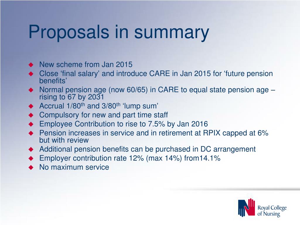 Proposals in summary • New scheme from Jan 2015 • Close ‘final salary’ and introduce CARE in Jan 2015 for ‘future pension benefits’ • Normal pension age (now 60/65) in CARE to equal state pension age – rising to 67 by 2031 • Accrual 1/80th and 3/80th ‘lump sum’ • Compulsory for new and part time staff • Employee Contribution to rise to 7.5% by Jan 2016 • Pension increases in service and in retirement at RPIX capped at 6% but with review • Additional pension benefits can be purchased in DC arrangement • Employer contribution rate 12% (max 14%) from14.1% • No maximum service