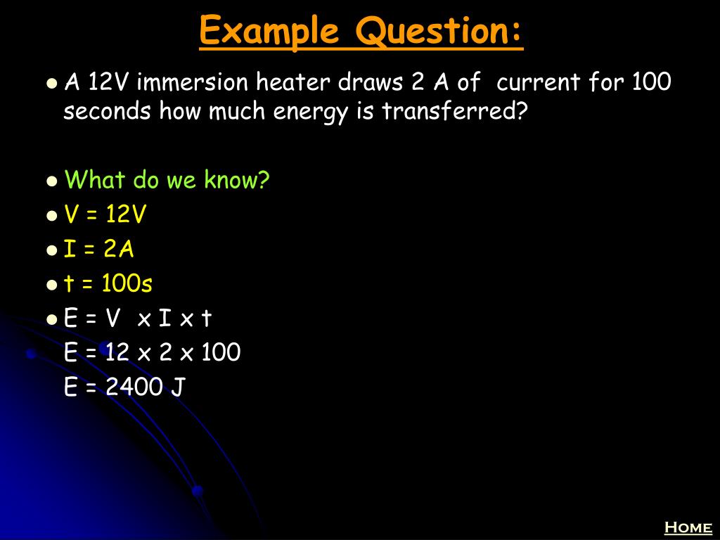 Example Question: • A 12V immersion heater draws 2 A of current for 100 seconds how much energy is transferred? • What do we know? • V = 12V • I = 2A • t = 100s • E = V x I x t E = 12 x 2 x 100 E = 2400 J