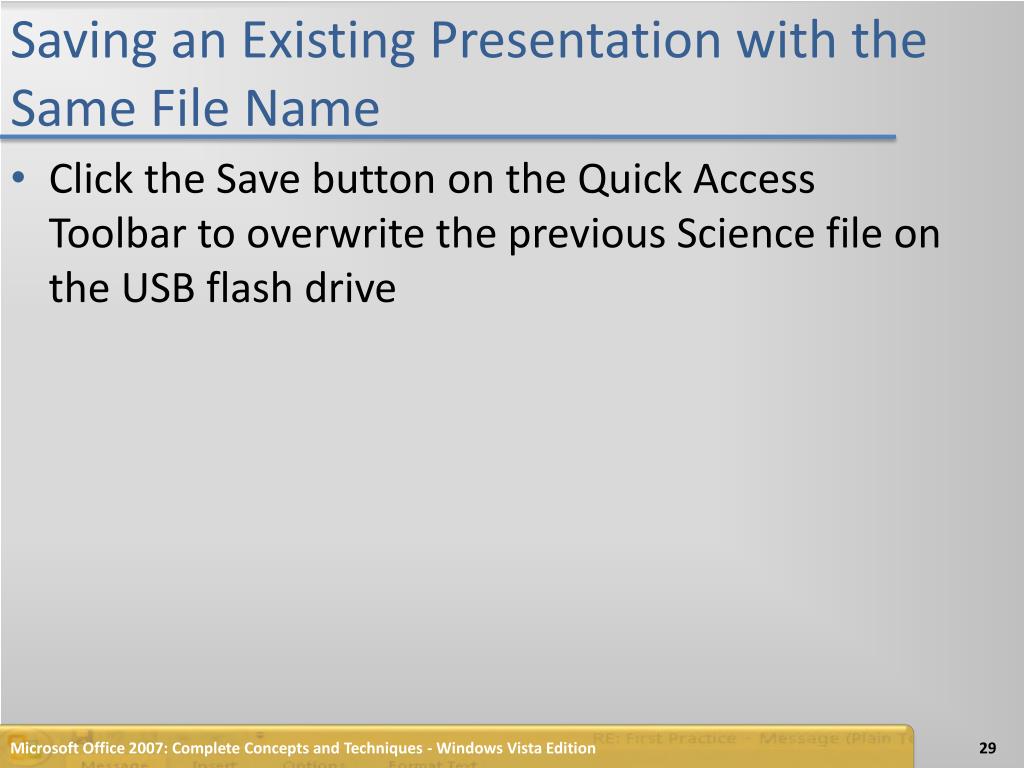 Saving an Existing Presentation with the Same File Name • Click the Save button on the Quick Access Toolbar to overwrite the previous Science file on the USB flash drive Microsoft Office 2007: Complete Concepts and Techniques - Windows Vista Edition