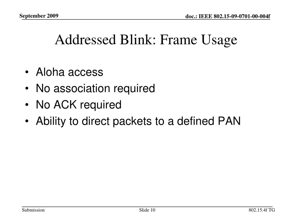 Addressed Blink: Frame Usage • Aloha access • No association required • No ACK required • Ability to direct packets to a defined PAN 802.15.4f TG