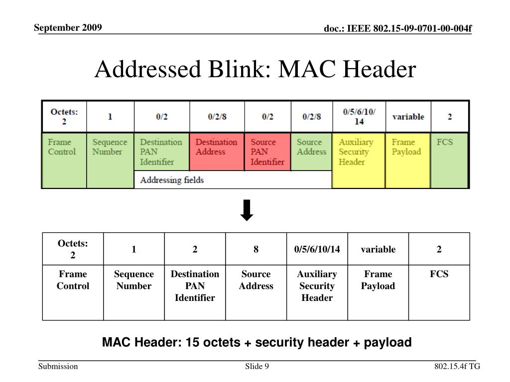 Addressed Blink: MAC Header Octets: 2 1 2 8 0/5/6/10/14 variable 2 Frame Control Sequence Number Destination PAN Identifier Source Address Auxiliary Security Header Frame Payload FCS MAC Header: 15 octets + security header + payload 802.15.4f TG