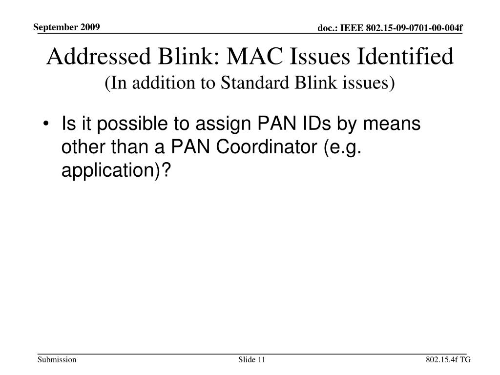 Addressed Blink: MAC Issues Identified(In addition to Standard Blink issues) • Is it possible to assign PAN IDs by means other than a PAN Coordinator (e.g. application)? 802.15.4f TG