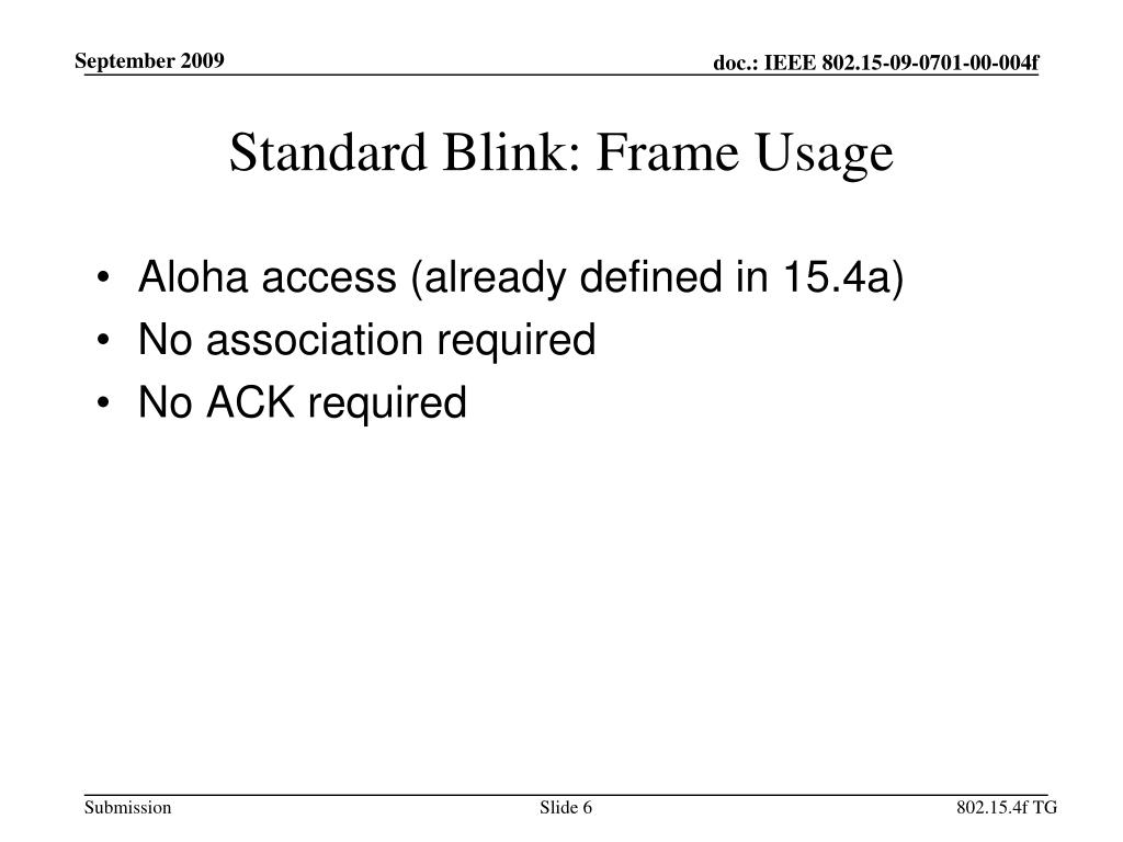 Standard Blink: Frame Usage • Aloha access (already defined in 15.4a) • No association required • No ACK required 802.15.4f TG