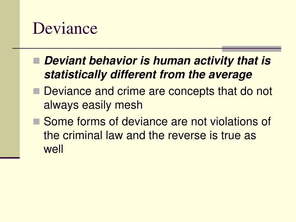 Deviance • Deviant behavior is human activity that is statistically different from the average • Deviance and crime are concepts that do not always easily mesh • Some forms of deviance are not violations of the criminal law and the reverse is true as well