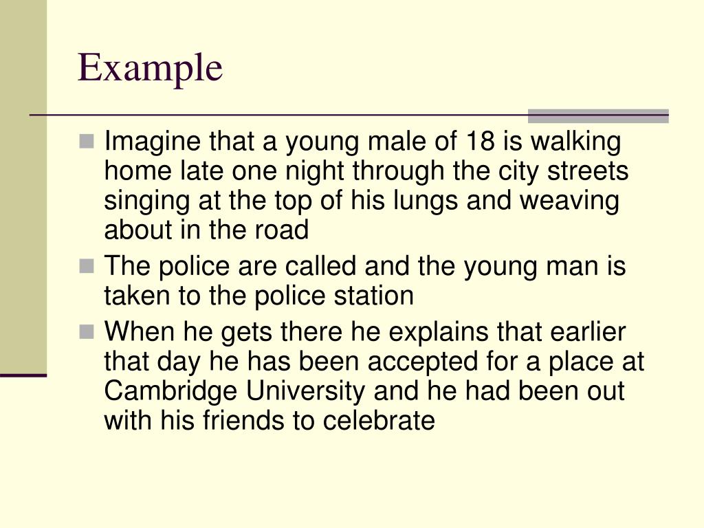 Example • Imagine that a young male of 18 is walking home late one night through the city streets singing at the top of his lungs and weaving about in the road • The police are called and the young man is taken to the police station • When he gets there he explains that earlier that day he has been accepted for a place at Cambridge University and he had been out with his friends to celebrate