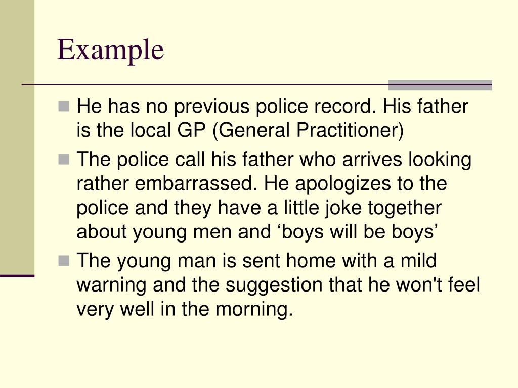 Example • He has no previous police record. His father is the local GP (General Practitioner) • The police call his father who arrives looking rather embarrassed. He apologizes to the police and they have a little joke together about young men and ‘boys will be boys’ • The young man is sent home with a mild warning and the suggestion that he won't feel very well in the morning.