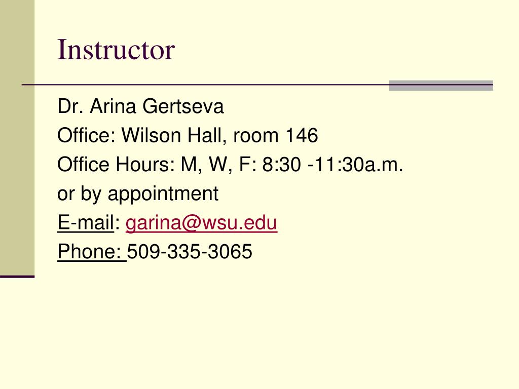 Instructor Dr. Arina Gertseva Office: Wilson Hall, room 146 Office Hours: M, W, F: 8:30 -11:30a.m. or by appointment E-mail: garina@wsu.edu Phone: 509-335-3065