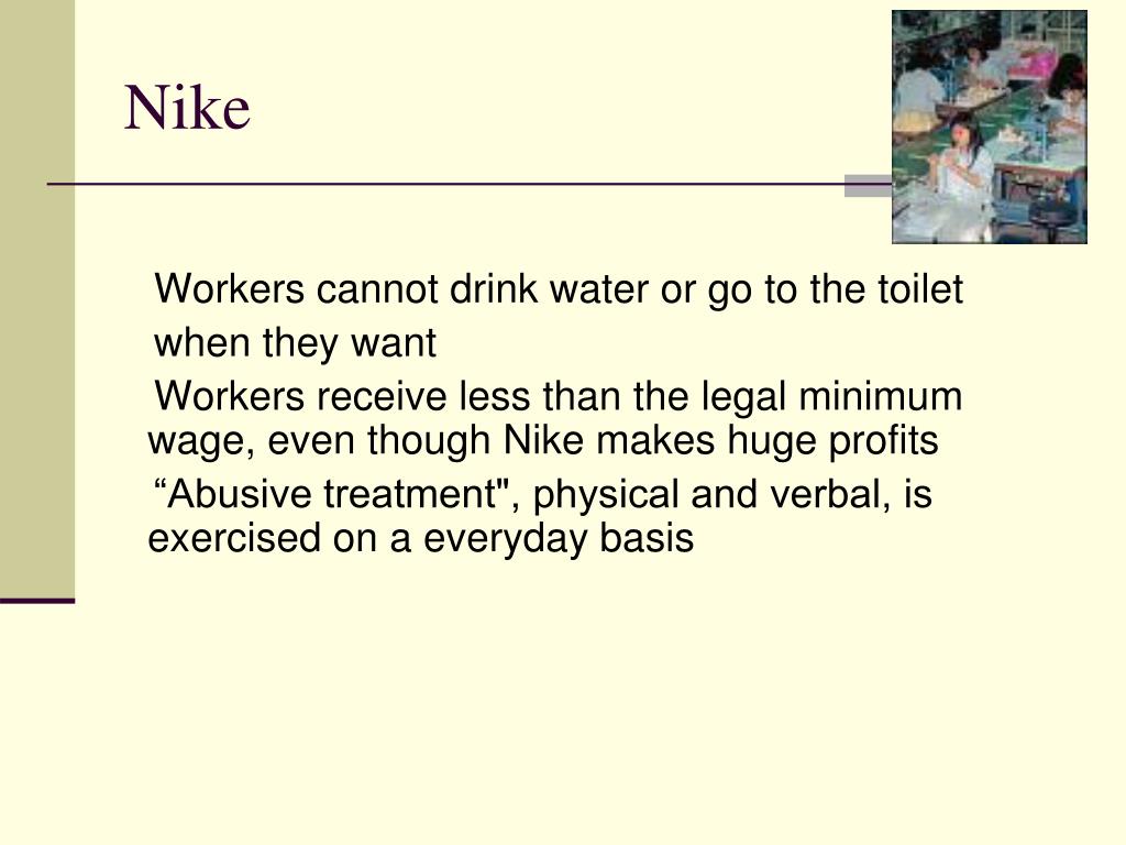 Nike Workers cannot drink water or go to the toilet when they want Workers receive less than the legal minimum wage, even though Nike makes huge profits “Abusive treatment", physical and verbal, is exercised on a everyday basis