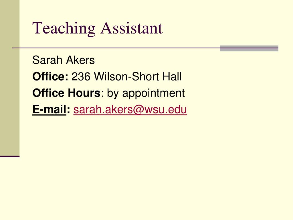 Teaching Assistant Sarah Akers Office: 236 Wilson-Short Hall Office Hours: by appointment E-mail: sarah.akers@wsu.edu