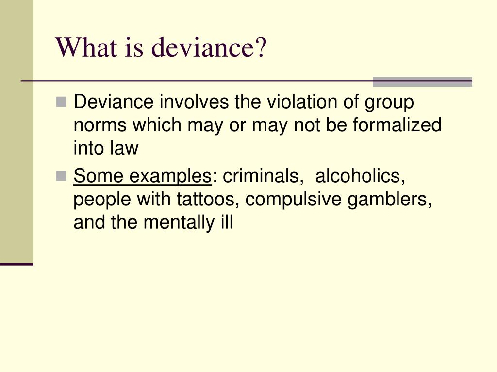 What is deviance? • Deviance involves the violation of group norms which may or may not be formalized into law • Some examples: criminals, alcoholics, people with tattoos, compulsive gamblers, and the mentally ill