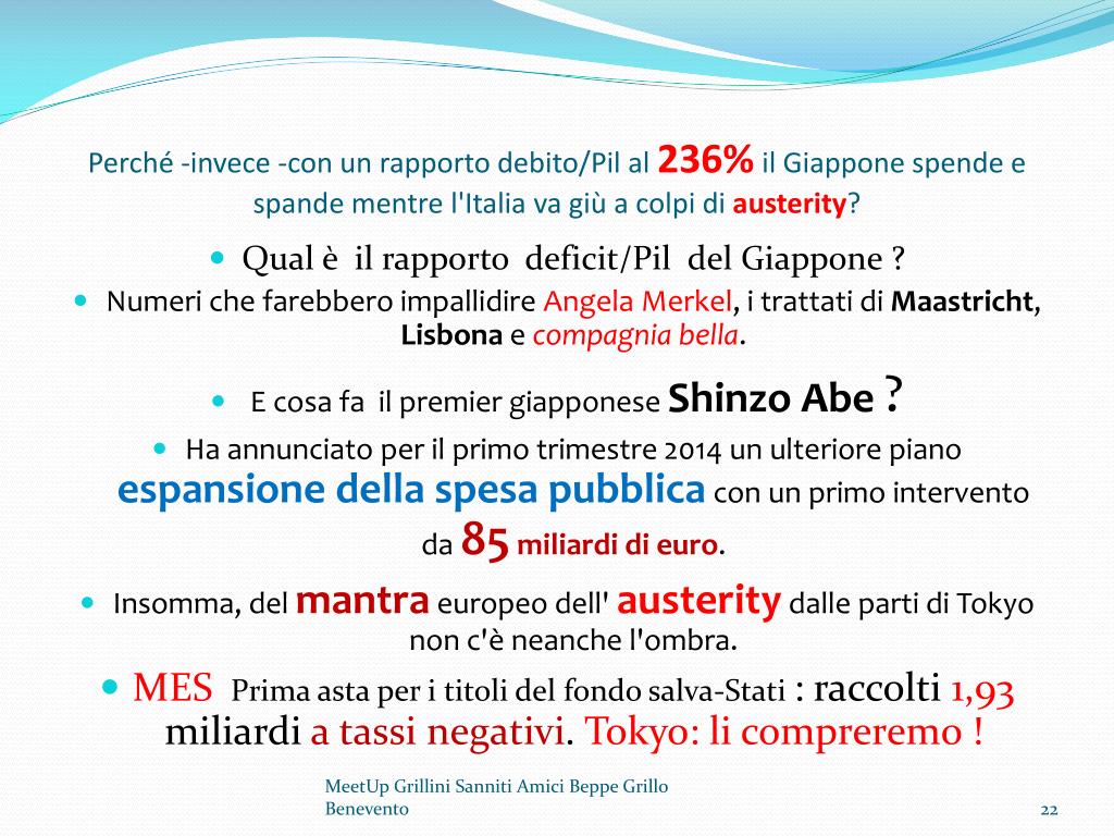 Perché -invece -con un rapporto debito/Pil al 236% il Giappone spende e spande mentre l'Italia va giù a colpi di austerity? • Qual è il rapporto deficit/Pil del Giappone ? • Numeri che farebbero impallidire Angela Merkel, i trattati di Maastricht, Lisbona e compagnia bella. • E cosa fa il premier giapponese Shinzo Abe ? • Ha annunciato per il primo trimestre 2014 un ulteriore piano espansione della spesa pubblica con un primo intervento da 85 miliardi di euro. • Insomma, del mantra europeo dell' austerity dalle parti di Tokyo non c'è neanche l'ombra. • MES Prima asta per i titoli del fondo salva-Stati: raccolti 1,93 miliardi a tassi negativi. Tokyo: li compreremo ! MeetUp Grillini Sanniti Amici Beppe Grillo Benevento
