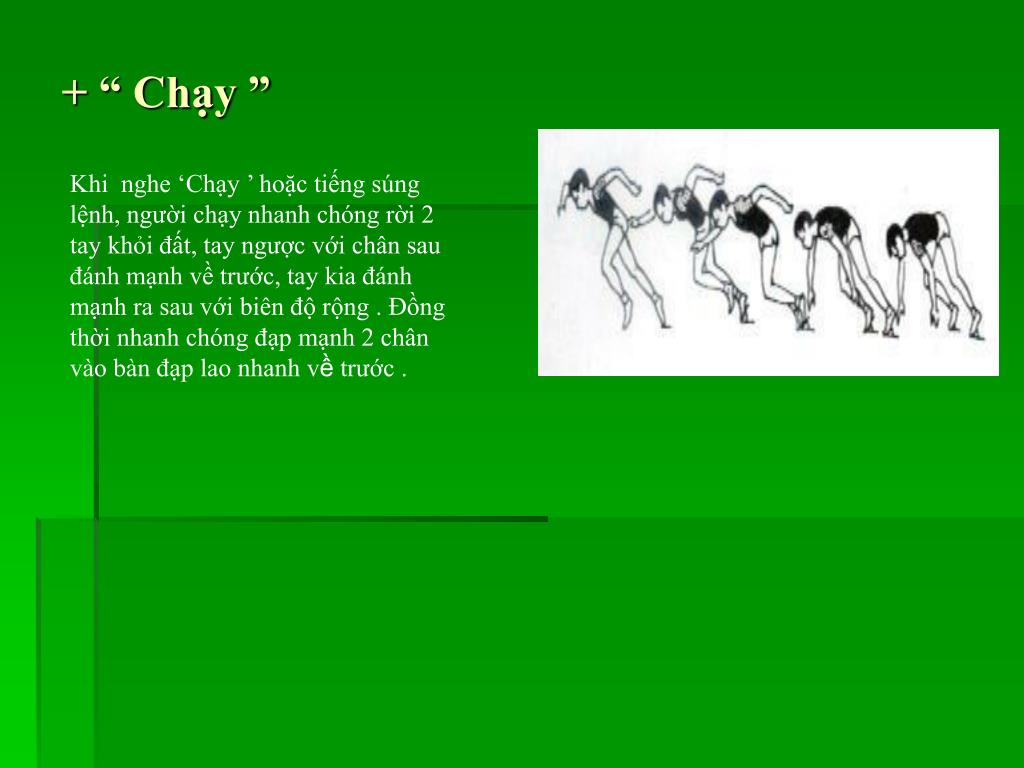 + “ Chạy ” Khi nghe ‘Chạy ’ hoặc tiếng súng lệnh, người chạy nhanh chóng rời 2 tay khỏi đất, tay ngược với chân sau đánh mạnh về trước, tay kia đánh mạnh ra sau với biên độ rộng . Đồng thời nhanh chóng đạp mạnh 2 chân vào bàn đạp lao nhanh về trước .