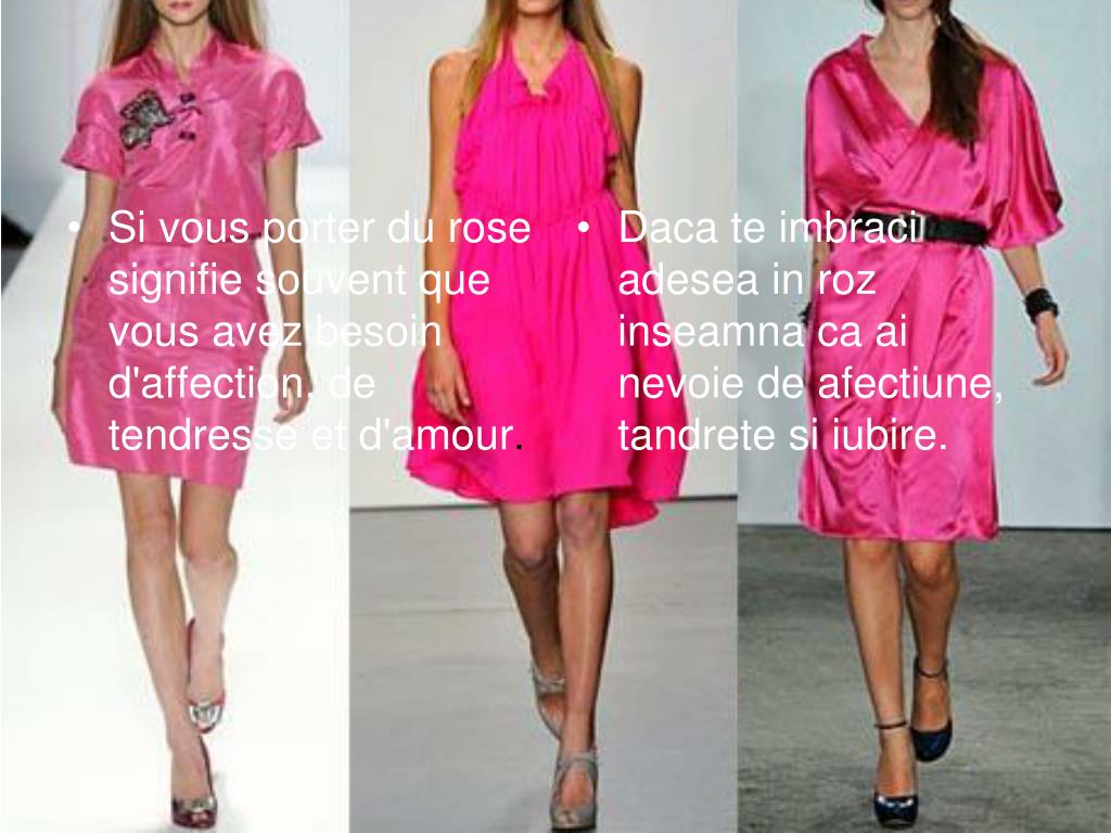 Si vous porter du rose signifie souvent que vous avez besoin d'affection, de tendresse et d'amour. Daca te imbraci adesea in roz inseamna ca ai nevoie de afectiune, tandrete si iubire.