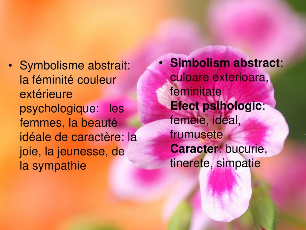 Simbolism abstract: culoare exterioara, feminitate Efect psihologic: femeie, ideal, frumusete Caracter: bucurie, tinerete, simpatie • Symbolisme abstrait: la féminité couleur extérieure psychologique: les femmes, la beauté idéale de caractère: la joie, la jeunesse, de la sympathie