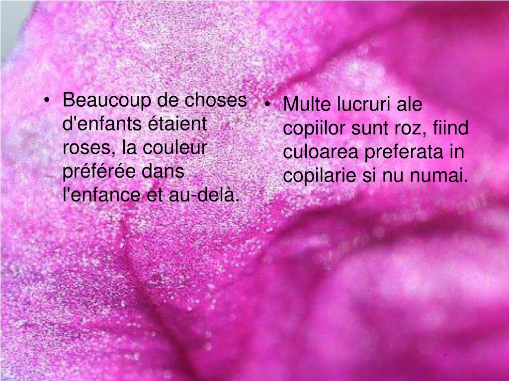 La couler rose. La couleur de la séduction, de la romance, la féminité, délicatesse, tendresse, bonheur et de la jeunesse. Este culoarea seductiei, romantismului, feminitatii, delicatetei, tandretii, fericirii si tineretii.