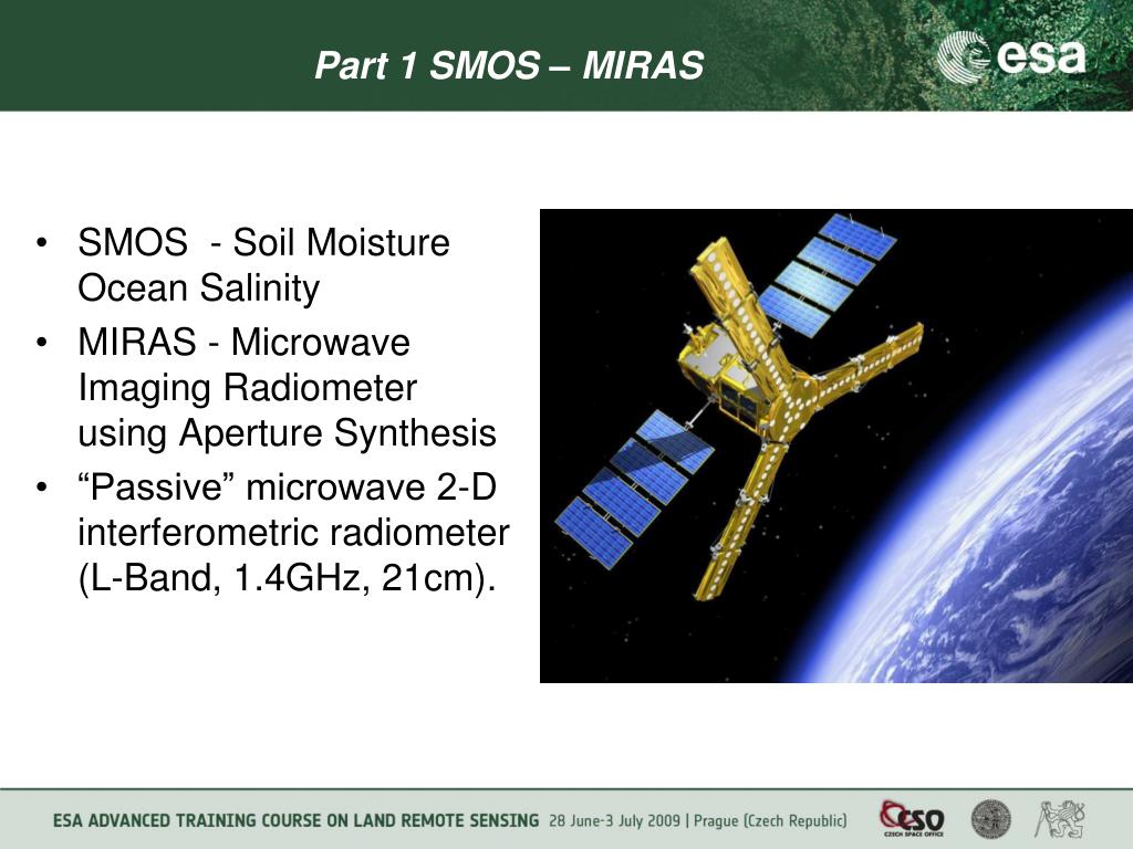 Part 1 SMOS – MIRAS • SMOS - Soil Moisture Ocean Salinity • MIRAS - Microwave Imaging Radiometer using Aperture Synthesis • “Passive” microwave 2-D interferometric radiometer (L-Band, 1.4GHz, 21cm).