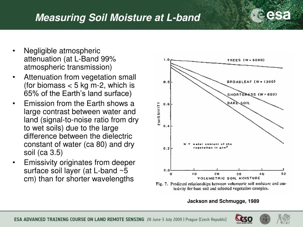 Measuring Soil Moisture at L-band • Negligible atmospheric attenuation (at L-Band 99% atmospheric transmission) • Attenuation from vegetation small (for biomass < 5 kg m-2, which is 65% of the Earth’s land surface) • Emission from the Earth shows a large contrast between water and land (signal-to-noise ratio from dry to wet soils) due to the large difference between the dielectric constant of water (ca 80) and dry soil (ca 3.5) • Emissivity originates from deeper surface soil layer (at L-band ~5 cm) than for shorter wavelengths Jackson and Schmugge, 1989