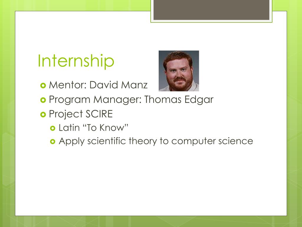Internship • Mentor: David Manz • Program Manager: Thomas Edgar • Project SCIRE • Latin “To Know” • Apply scientific theory to computer science