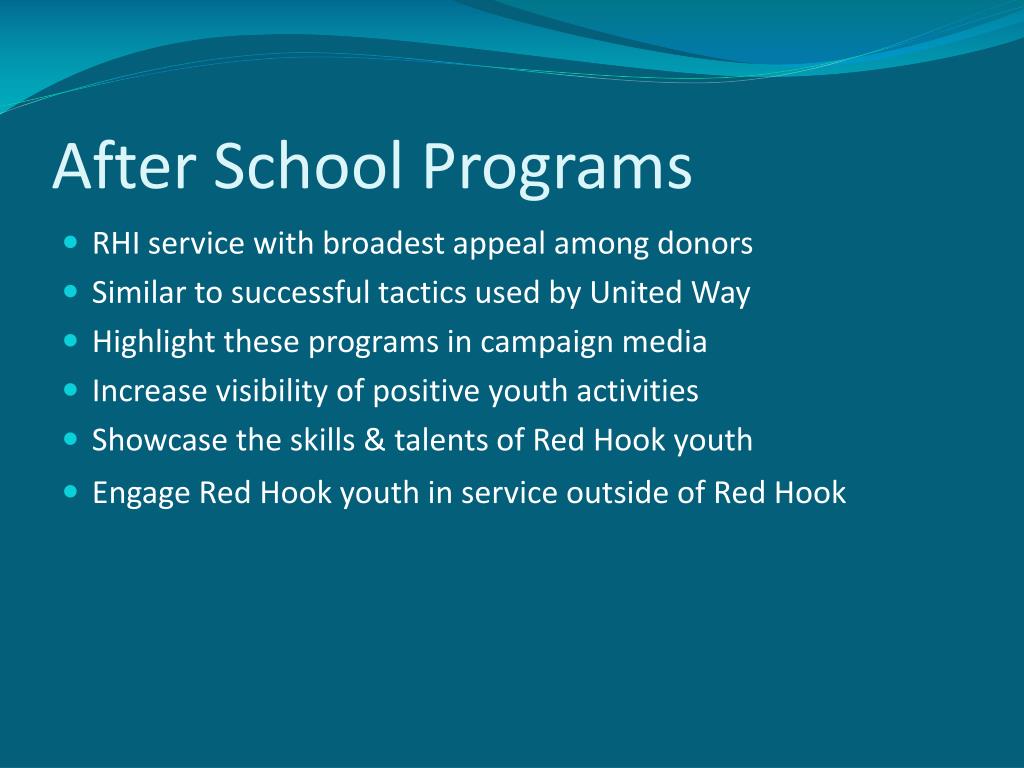 After School Programs • RHI service with broadest appeal among donors • Similar to successful tactics used by United Way • Highlight these programs in campaign media • Increase visibility of positive youth activities • Showcase the skills & talents of Red Hook youth • Engage Red Hook youth in service outside of Red Hook