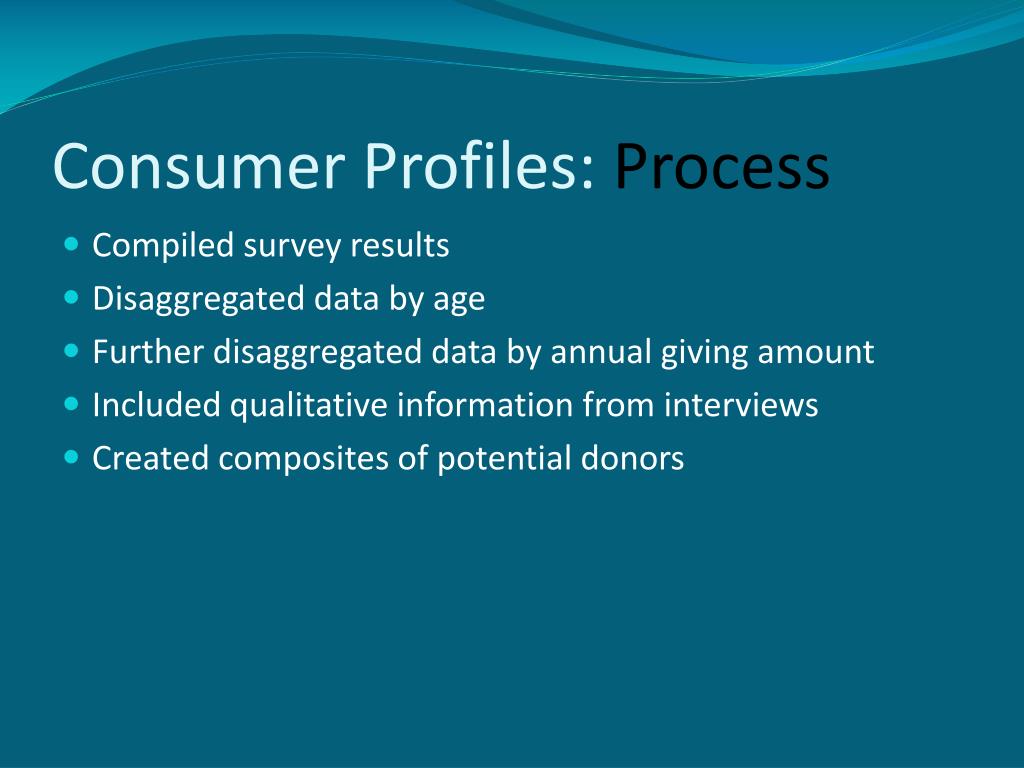 Consumer Profiles: Process • Compiled survey results • Disaggregated data by age • Further disaggregated data by annual giving amount • Included qualitative information from interviews • Created composites of potential donors