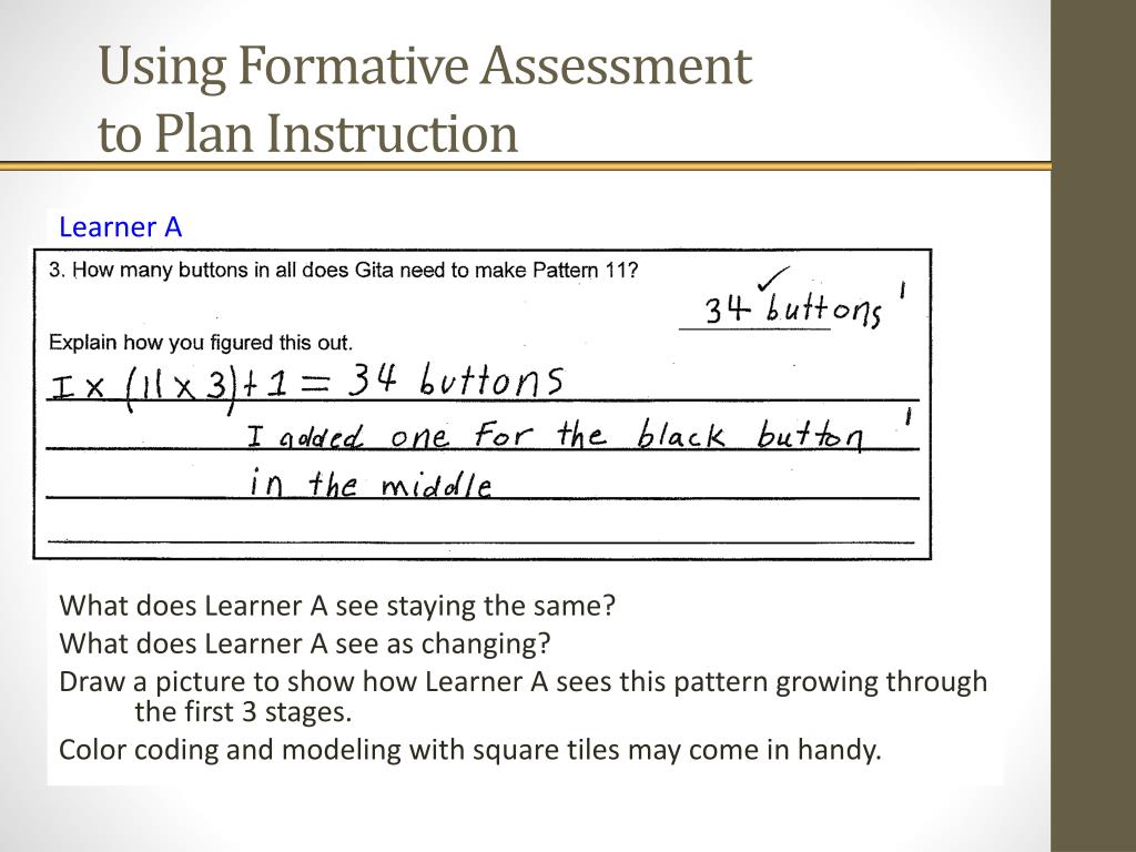 Using Formative Assessment to Plan Instruction Learner A What does Learner A see staying the same? What does Learner A see as changing? Draw a picture to show how Learner A sees this pattern growing through the first 3 stages. Color coding and modeling with square tiles may come in handy.