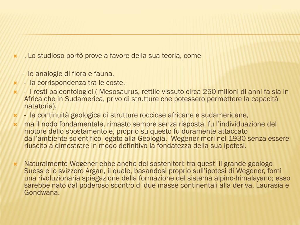 . Lo studioso portò prove a favore della sua teoria, come - le analogie di flora e fauna, • - la corrispondenza tra le coste, • - i resti paleontologici ( Mesosaurus, rettile vissuto circa 250 milioni di anni fa sia in Africa che in Sudamerica, privo di strutture che potessero permettere la capacità natatoria), • - la continuità geologica di strutture rocciose africane e sudamericane, • ma il nodo fondamentale, rimasto sempre senza risposta, fu l’individuazione del motore dello spostamento e, proprio su questo fu duramente attaccato dall’ambiente scientifico legato alla Geologia. Wegener morì nel 1930 senza essere riuscito a dimostrare in modo definitivo la fondatezza della sua ipotesi. • Naturalmente Wegener ebbe anche dei sostenitori: tra questi il grande geologo Suess e lo svizzero Argan, il quale, basandosi proprio sull’ipotesi di Wegener, fornì una rivoluzionaria spiegazione della formazione del sistema alpino-himalayano; esso sarebbe nato dal poderoso scontro di due masse continentali alla deriva, Laurasia e Gondwana.