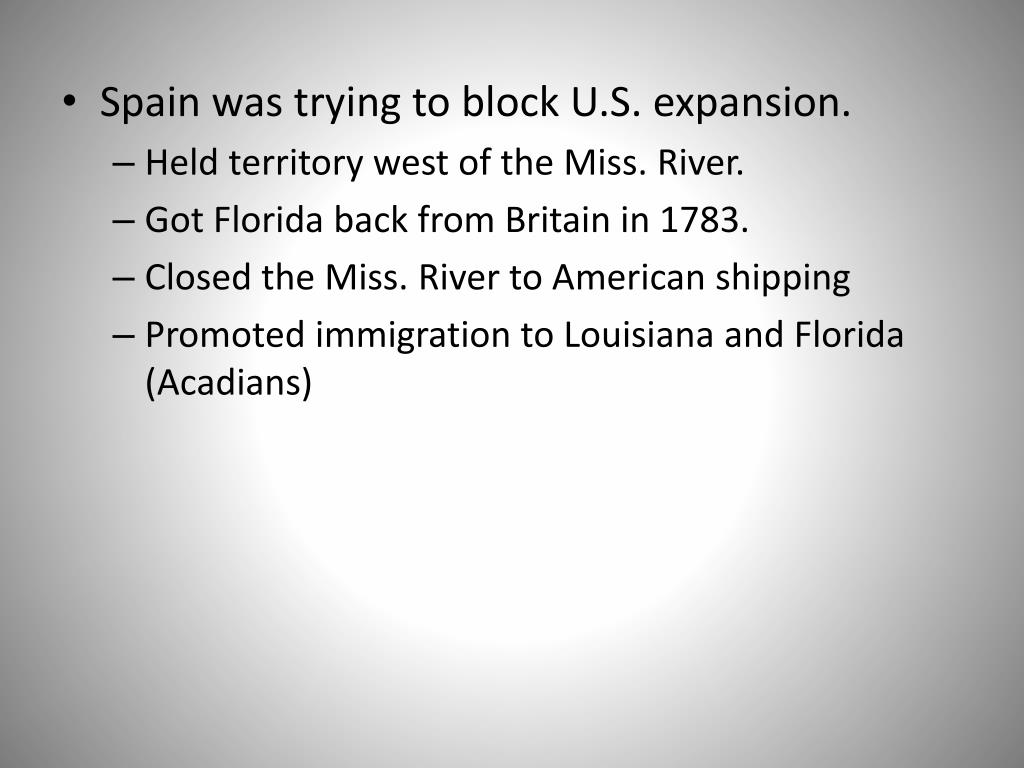 Spain was trying to block U.S. expansion. • Held territory west of the Miss. River. • Got Florida back from Britain in 1783. • Closed the Miss. River to American shipping • Promoted immigration to Louisiana and Florida (Acadians)