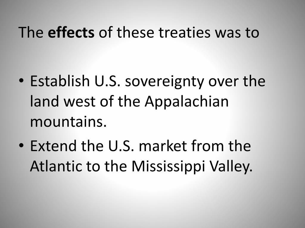 The effects of these treaties was to • Establish U.S. sovereignty over the land west of the Appalachian mountains. • Extend the U.S. market from the Atlantic to the Mississippi Valley.